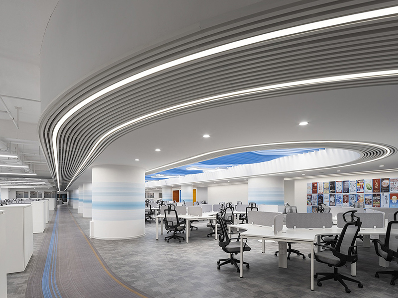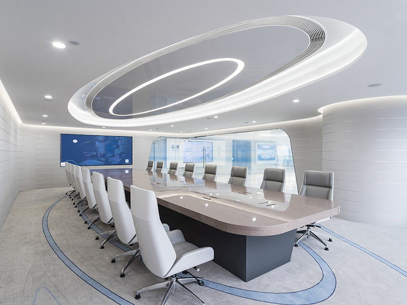 其中,形式层次感和色彩层次感的主要表现形式是:形式之上的简单与直观相融合,色彩之上的深浅相融合。例如,公共办公区的天花和墙面可展开流畅的处理,而前台、会议室、领导办公室等重点区域应展开合适的设计,使整个办公楼的复杂性和简洁性表达到极致。
