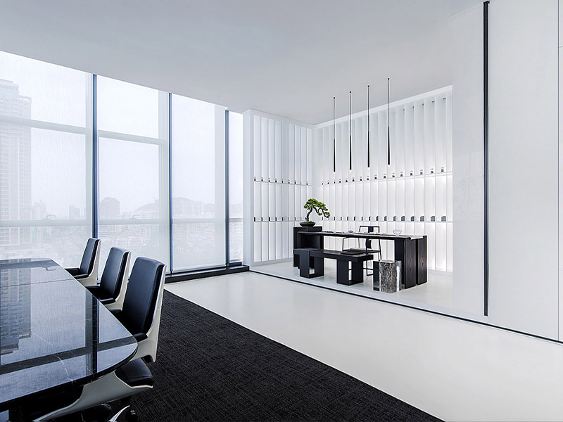 颜色方面,主色应采用黑白灰等更为精炼的颜色来营造干净整洁的视觉效果,这样也更能体现办公空间的现代感。特别是黑色与白色的搭配,不但显得自然饱满,而且能达到放大空间的视觉效果,有助于提升整个办公空间的品质感。
