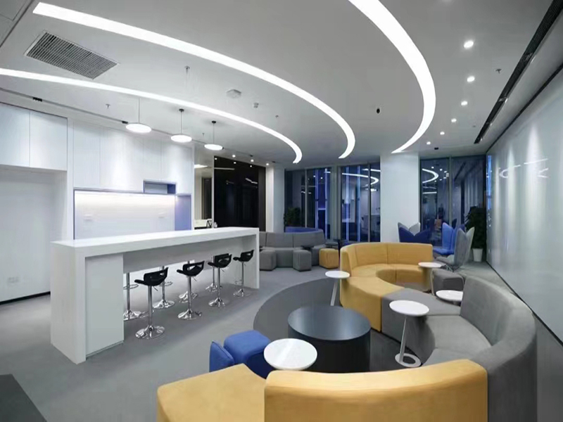 简约风格首先色调就是简单的纯色搭配,米白色或者蓝色比较合适,另外利用灯带和射灯做灯光效果,尤其是小公司的前台,灯光可以让原本的小空间看起来更广阔。此类设计风格比较适合新型的中小型企业,新兴行业。