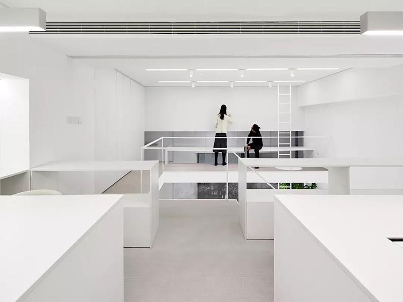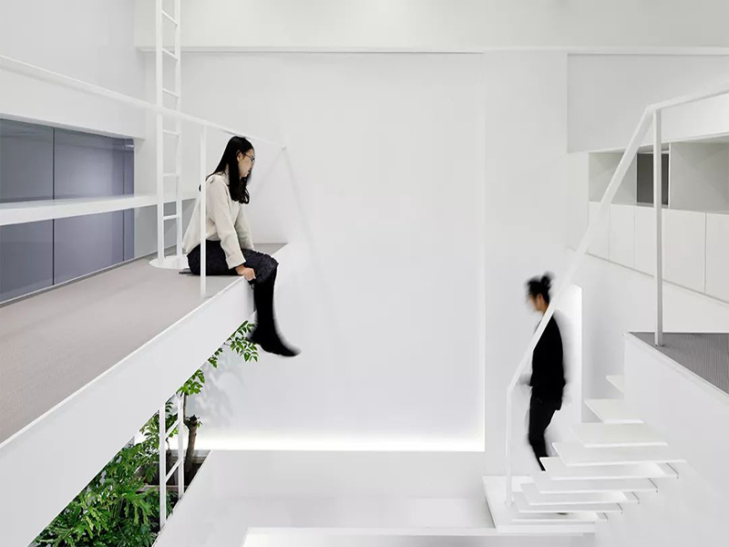 白色的空间有利于工作的专注,办公室为设计师们准备的宽阔的一体化的工作台。定制的共享桌面便于从单人工作转向团队合作。各种线路则被隐藏在桌子的内部。工作储存单元沿着办公室的侧墙分布开来,足以容纳所有人的物品。一层高大的植物透过微小的中庭长到二楼,使得一二层在垂直方向多了更多交流,同时也将二楼的大工作区自然的分为两个单元。
