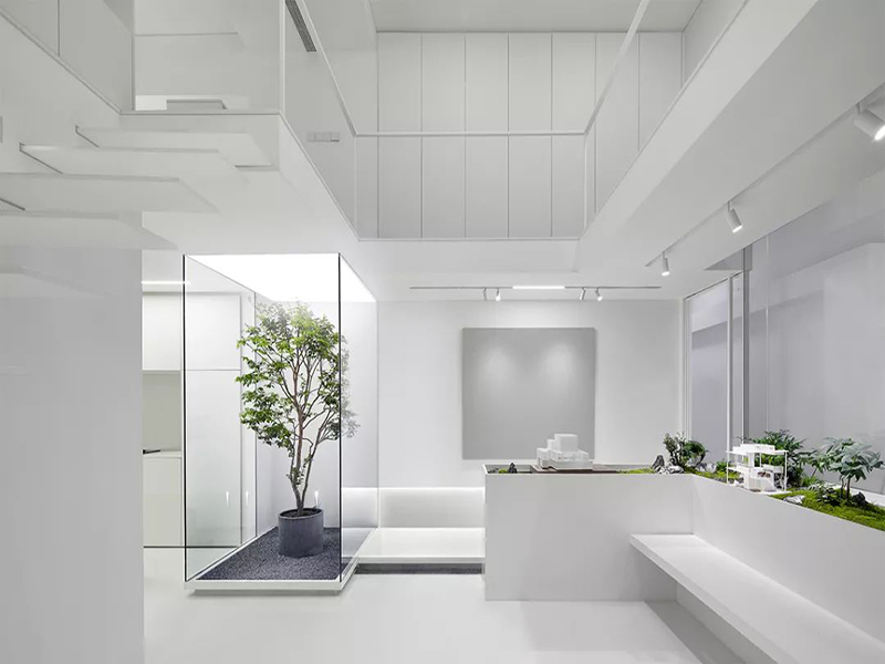 设计中剥除了材质与色彩干扰,纯白空间的运用强化了空间的关系和氛围,同时让室内的植物葱郁而又安宁。设计师试图在空间中打造出多样化的空间,连续的平面布局在封闭,半通透,通透的空间中,东方式的犹抱琵琶半遮面,未成曲调先有情。