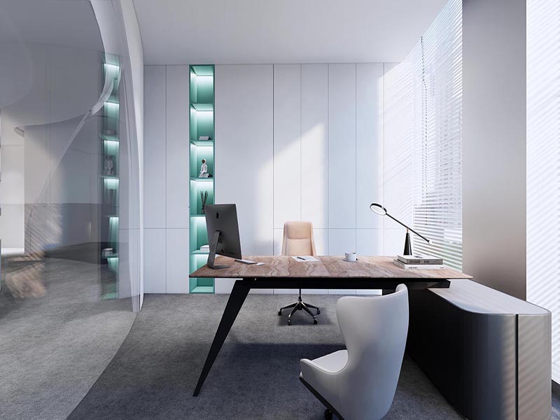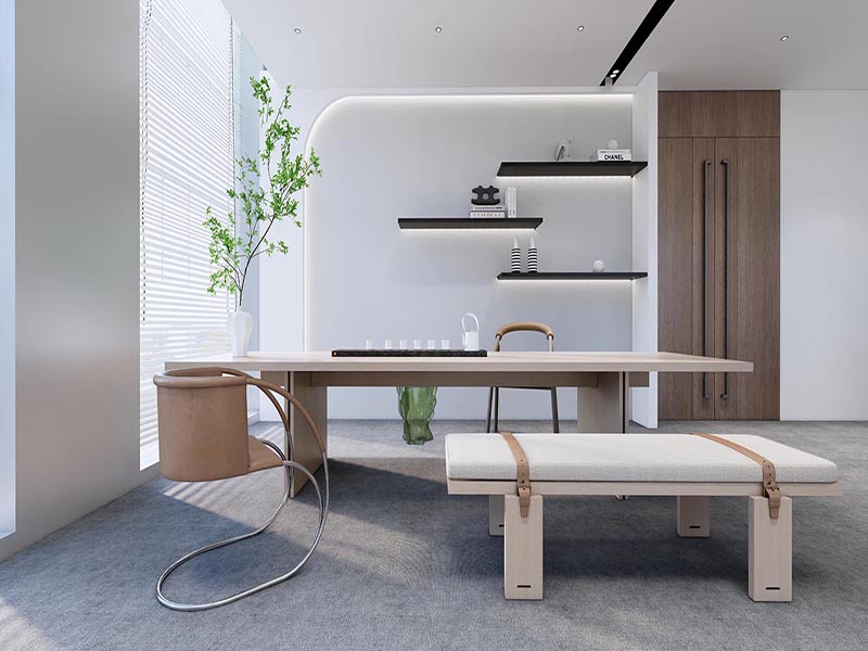 装修作风不同于普通办公室的严肃安静,可根据个人喜好随心所欲地布置,但应以不分散留意力,便于清洁打扫为限。假设房间面积足够,可思索在室内放置一些花草,可以增加颜色,还可以净化空气。