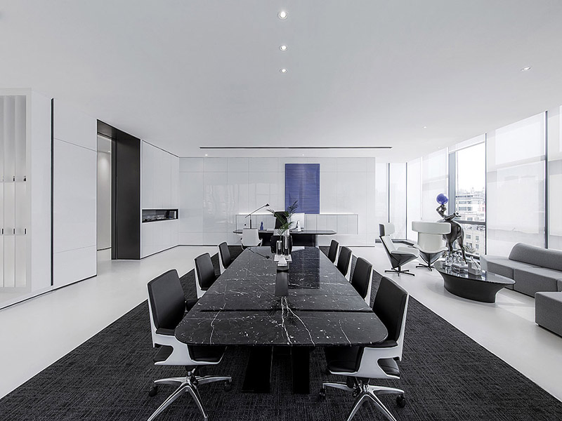 颜色方面,主色应采用黑白灰等更为精炼的颜色来营造干净整洁的视觉效果,这样也更能体现办公空间的现代感。特别是黑色与白色的搭配,不但显得自然饱满,而且能达到放大空间的视觉效果,有助于提升整个办公空间的品质感。