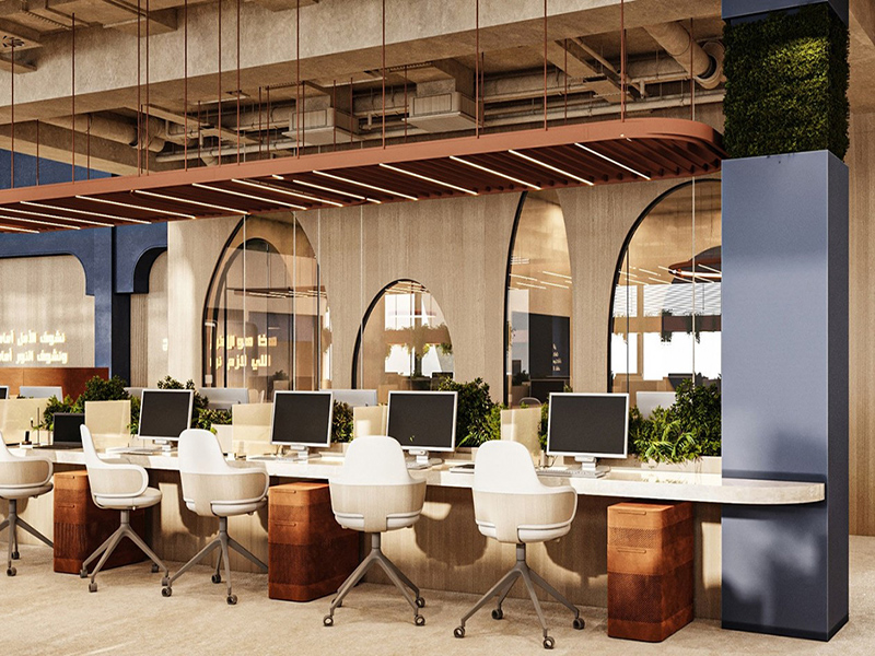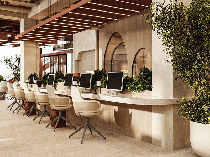 办公室整体的视觉效果也是非常重要的,主要是在办公室装修时用色不宜过于复杂,建议选择浅色、饱和度较低、柔和明亮的颜色作为主色调,给人一种视觉延伸的效果,让空间看起来更大。在打造办公采光条件时,最好采用中性灯光,且灯光要足够明亮,给人以敞亮且悦目的视觉感受。