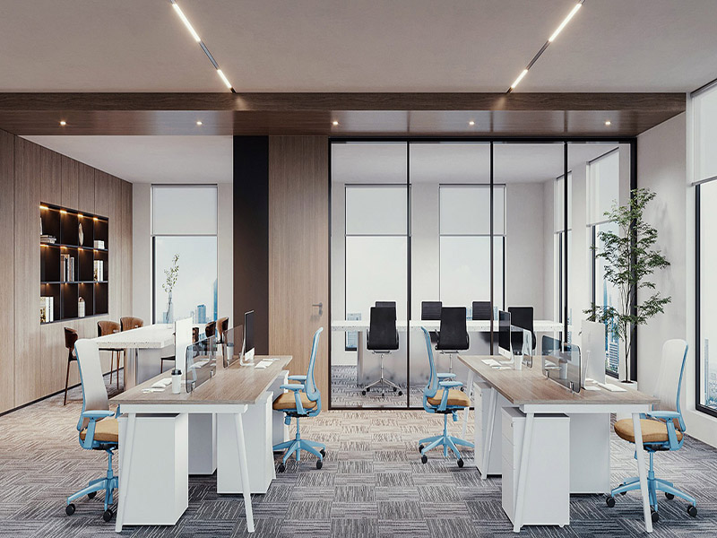 首先,现代创意办公室设计装修方便地切换办公室内的所有灯,调节空调开关的亮度,调整窗帘的升降角度,并通过办公场所的触摸屏或智能按键面板控制场景切换。