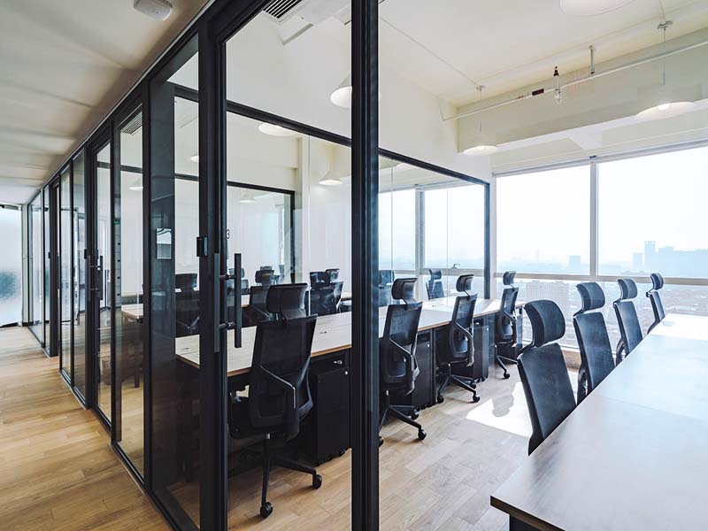 玻璃的装饰性能是活性的、动态的,充满着极大的可塑性,它与日光辉映可使建筑物色彩斑斓、光彩照人。隔断、屏风甚至整面墙,都可以用玻璃制成。在办公室装修效果图中使用了玻璃隔断,不仅增加了办公室的视觉面积,还给人明亮温和的感受。