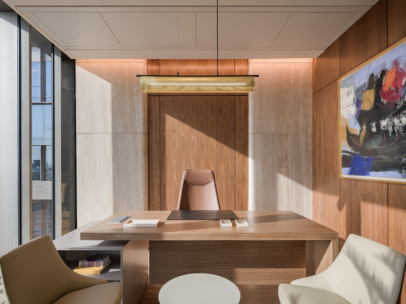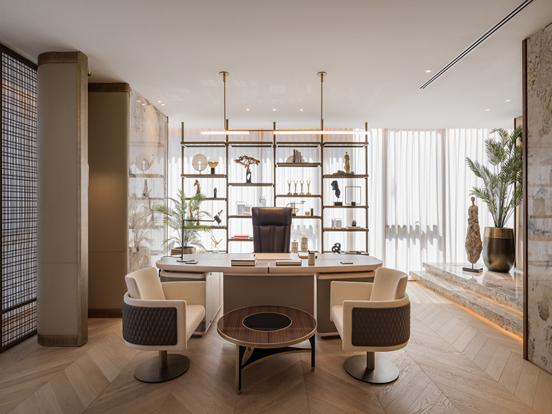 从装修的特点来看,传统风格会尽量选择造型保守,方方正正的摆设和办公用品,在材质选择上比较考究,更加强调气质的高贵和尊荣。