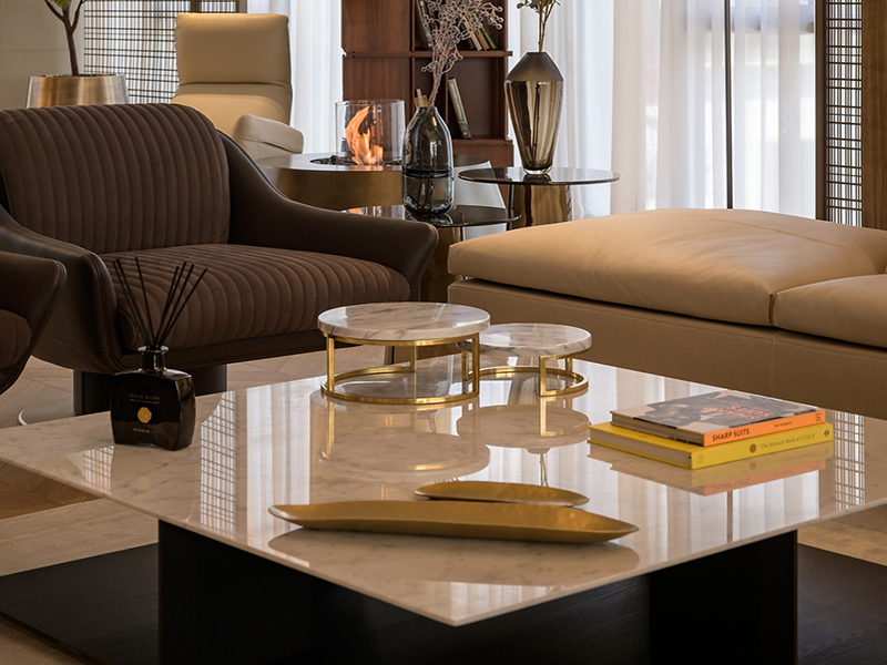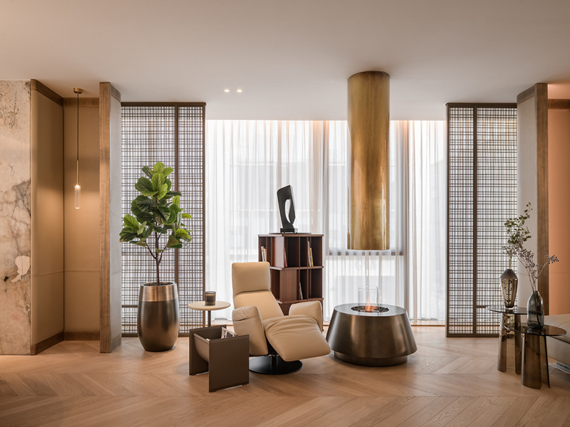 融合自然、追求自由真实以及复古艺术为设计宗旨。主要表现形式为,大理石、山水画、中式家具、青铜饰面的装饰、大型盆栽等等。