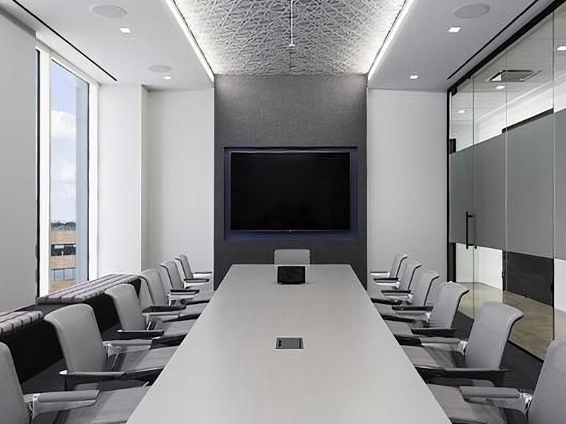 会议室有两种功能,一个是传达公司方针、公司决策、方向落实、员工培训、公司文化普及之用;此外,其还有接待客户洽谈会议之用途。二者功能可以统一,也可单独开辟独立空间作为专门的洽谈室用于接待来访的宾客。一般来讲,会议洽谈室要配备投影视频、音响、远程对话等功能,还可以摆放公司的一些荣誉奖牌、锦旗等作为装饰。一块大尺寸的白板作为会议室的标准配置。
