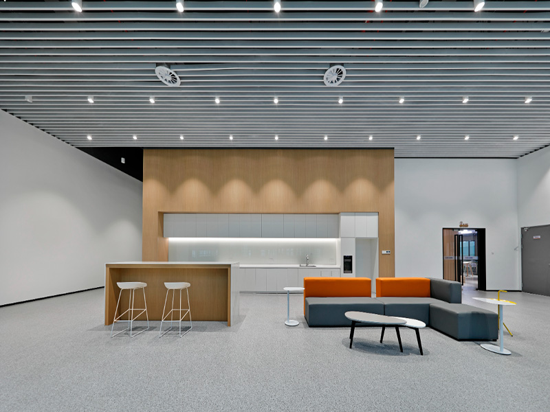 接待区域的设计:当客户跨过前台之后,顺着动线就进入到接待区域,接待区域被设计师安置在动线、空间的交叉处,此处不管是向左还是向右,可以进入到两个不同的空间,在此处安置接待区域,不仅可以起到接待的作用,同时也不会对空间造成影响。