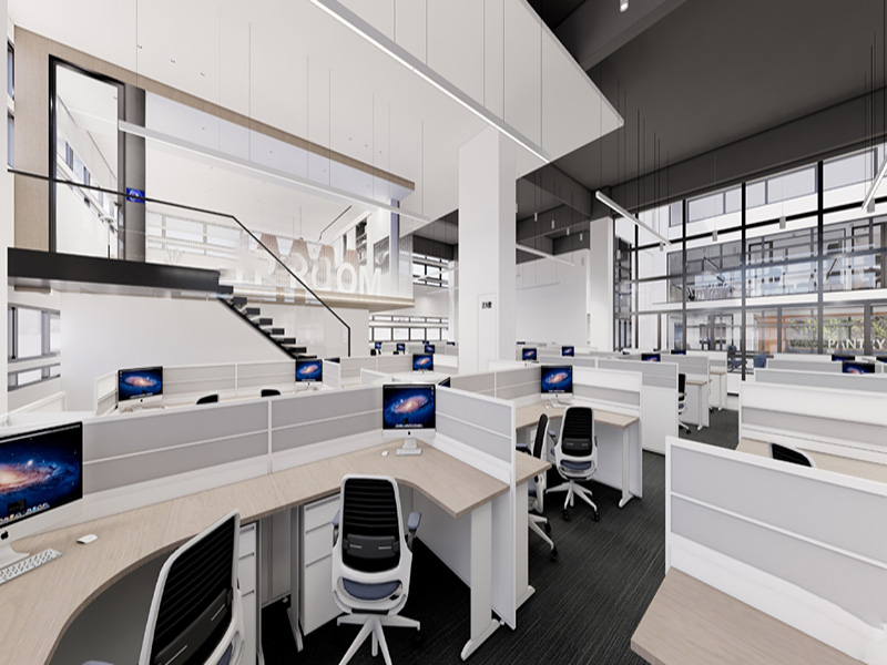 办公区域的设计:悬挂的隔断如一扇扇门将办公区域挡在视线之外,但悬挂的隔断不是死的而是灵活的,一扇扇可拉可合,开放的办公区加上半封闭的个人办公区,两者之间形成一个很好的结合,这样的设计旨在消除弊端,同时也在为企业营造利于发展的办公新格局。